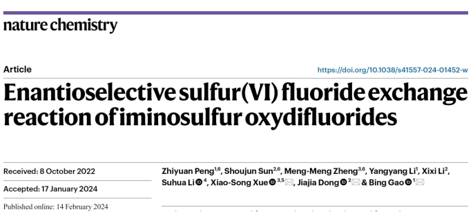 相关工作以“Enantioselective sulfur(VI) fluoride exchange reaction of iminosulfur oxydifluorides”为题发表在国际化学顶级期刊Nature Chemistry。该研究工作得到上海交通大学董佳家课题组的支持和帮助,为课题提供关键原料和技术支撑;中科院上海有机化学研究所、杭州高等研究院薛小松课题组在机理研究和理论计算方面做出了重要贡献。两位教授和所在单位均为共同通讯;565net亚洲必赢官网为第一通讯单位。565net亚洲必赢官网化学化工学院博士生彭志媛为论文的第一作者,合作单位孙守军博士、郑蒙蒙博士为共同第一作者。此外,中山大学李苏华教授也对课题开展提供了宝贵建议。该项目得到了国家自然科学基金委、565net亚洲必赢官网化学化工学院、化学生物传感与计量学国家重点实验室支持。