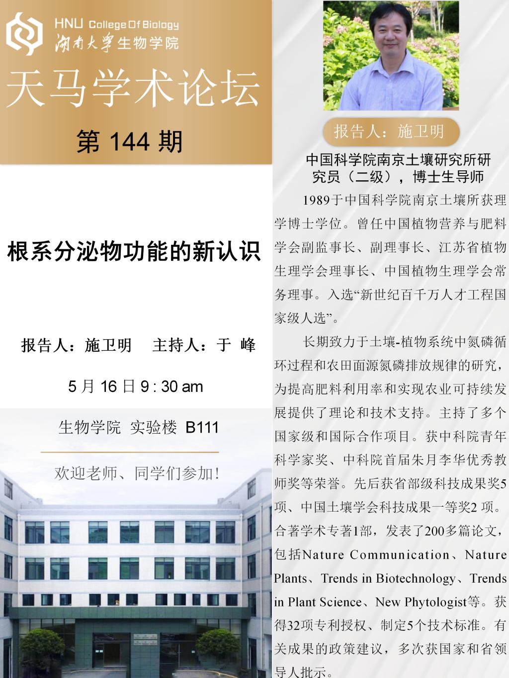 学术地点 生物学院实验楼B111 主讲人 施卫明