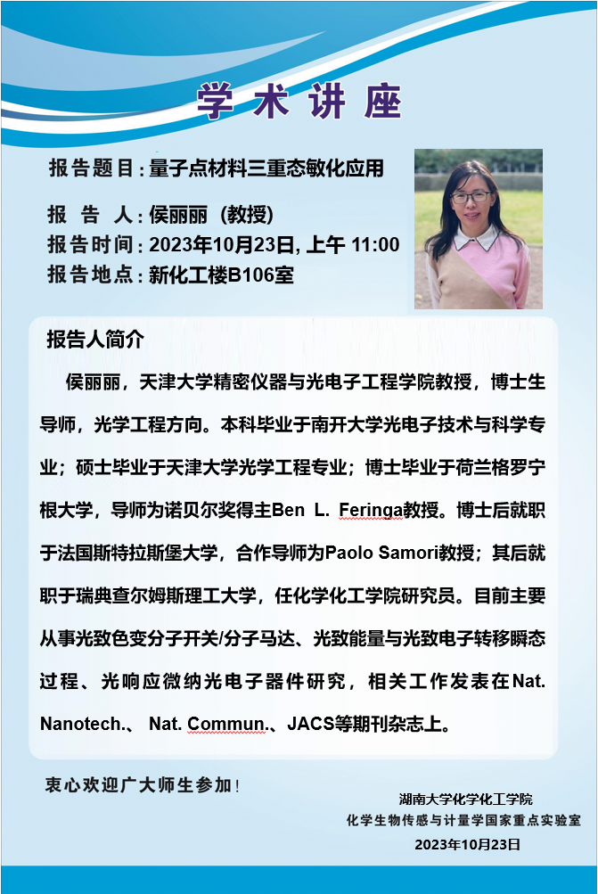 学术地点 新化工楼B106室 主讲人 侯丽丽