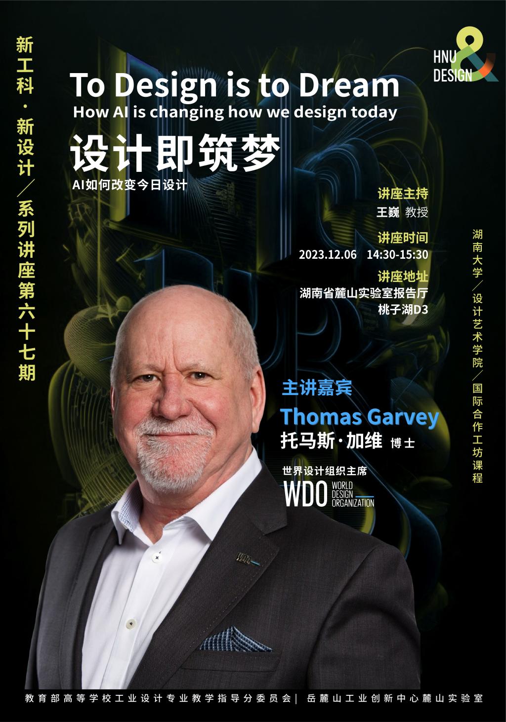 学术地点 湖南省麓山实验室报告厅桃子湖D3 主讲人 托马斯·加维,世界设计组织主席