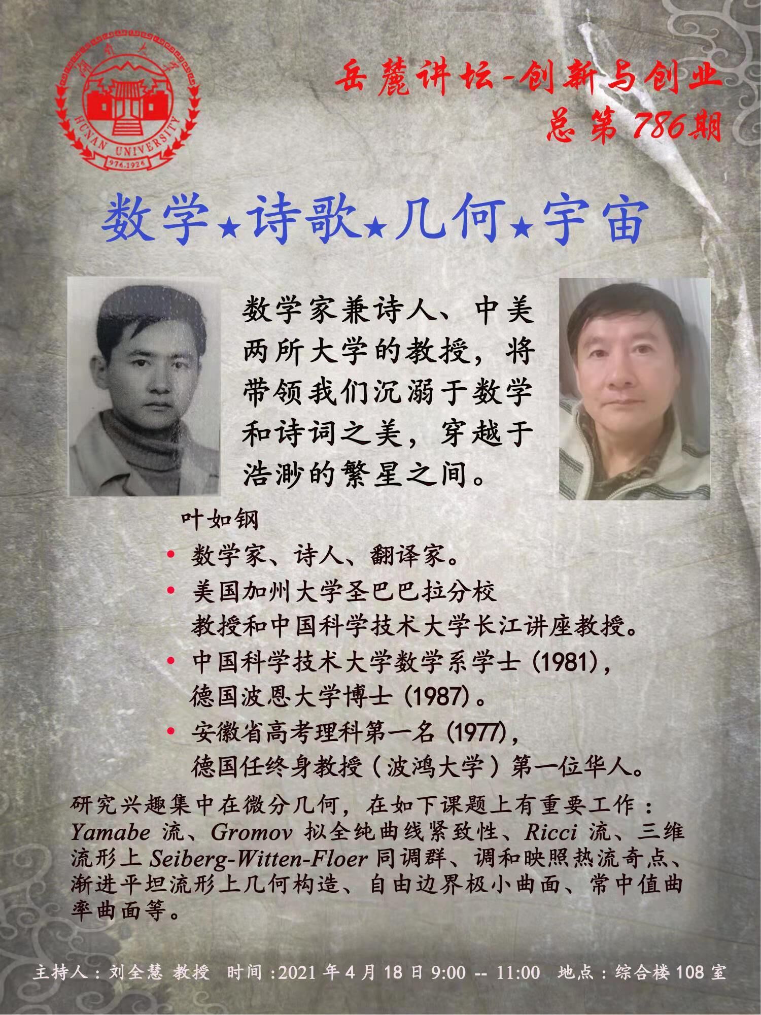 叶如钢,数学家、诗人、翻译家。美国加州大学圣巴巴拉分校教授和中国科学技术大学长江讲座教授。中国科学技术大学数学系学士(1981),德国波恩大学博士(1987)。1977年安徽省高考理科第一名,德国任终身教授(波鸿大学)的第一位华人。