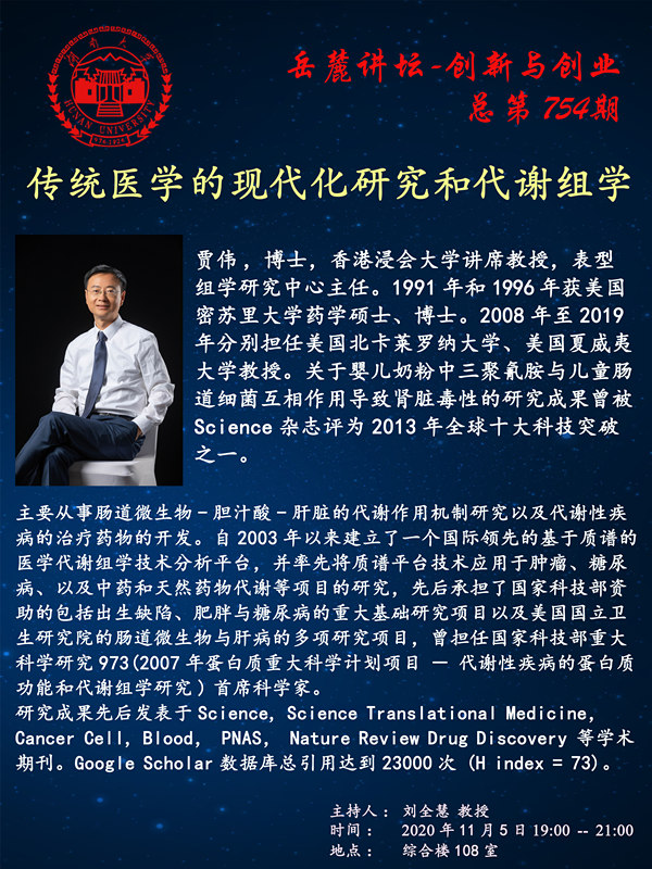 贾伟, 博士,香港浸会大学讲席教授,表型组学研究中心主任。1991年和1996年获美国密苏里大学药学硕士、博士。2008年至2019年分别担任美国北卡莱罗纳大学、美国夏威夷大学教授。关于婴儿奶粉中三聚氰胺与儿童肠道细菌互相作用导致肾脏毒性的研究成果曾被Science杂志评为2013年全球十大科技突破之一。