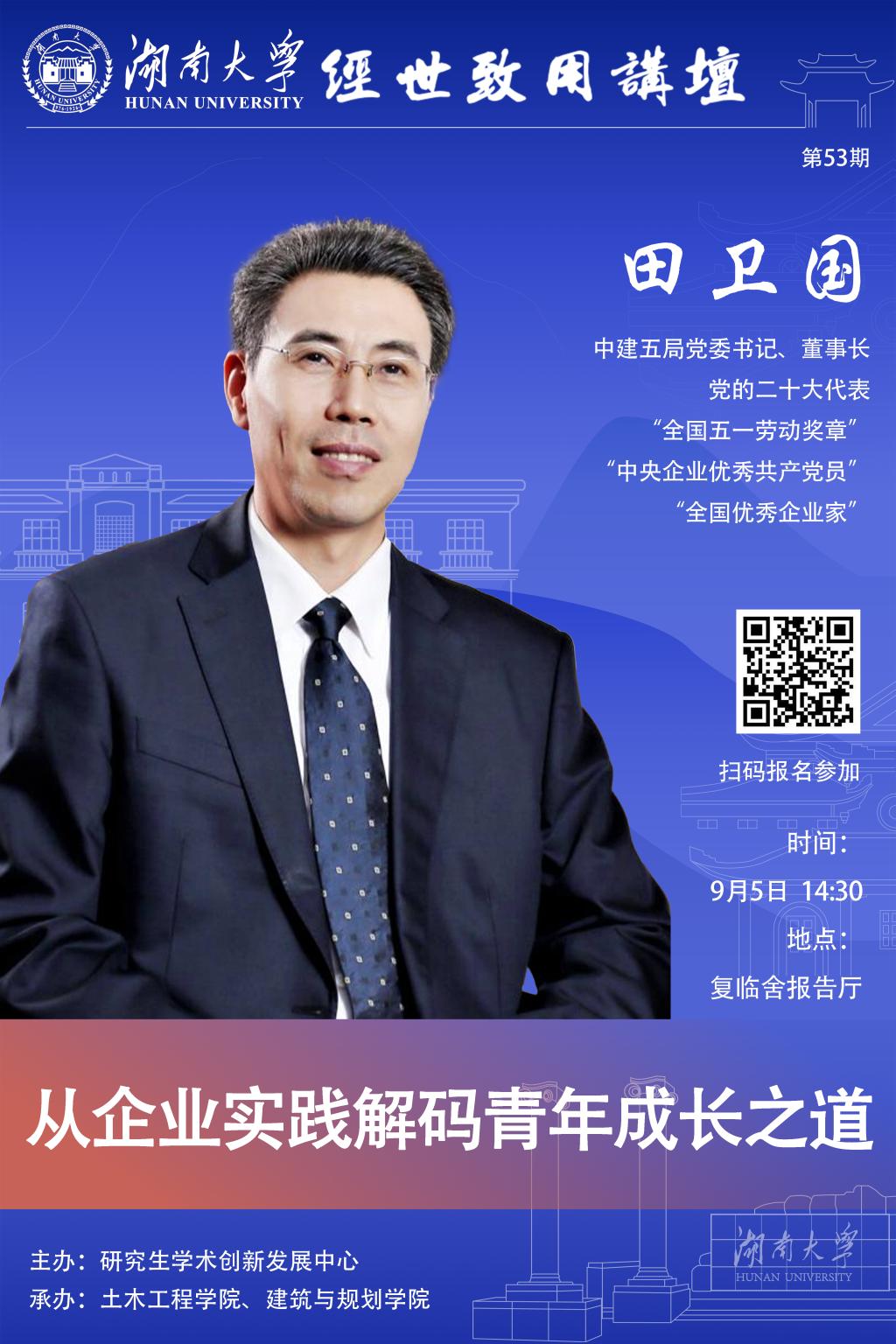 9月5日14:30邀请中建五局党委书记、董事长、“全国五一劳动奖章”获得者田卫国老师于复临舍报告厅作“从企业实践解码青年成长之道”主题报告,欢迎同学们前来听讲。参加方式详见海报,敬请期待!