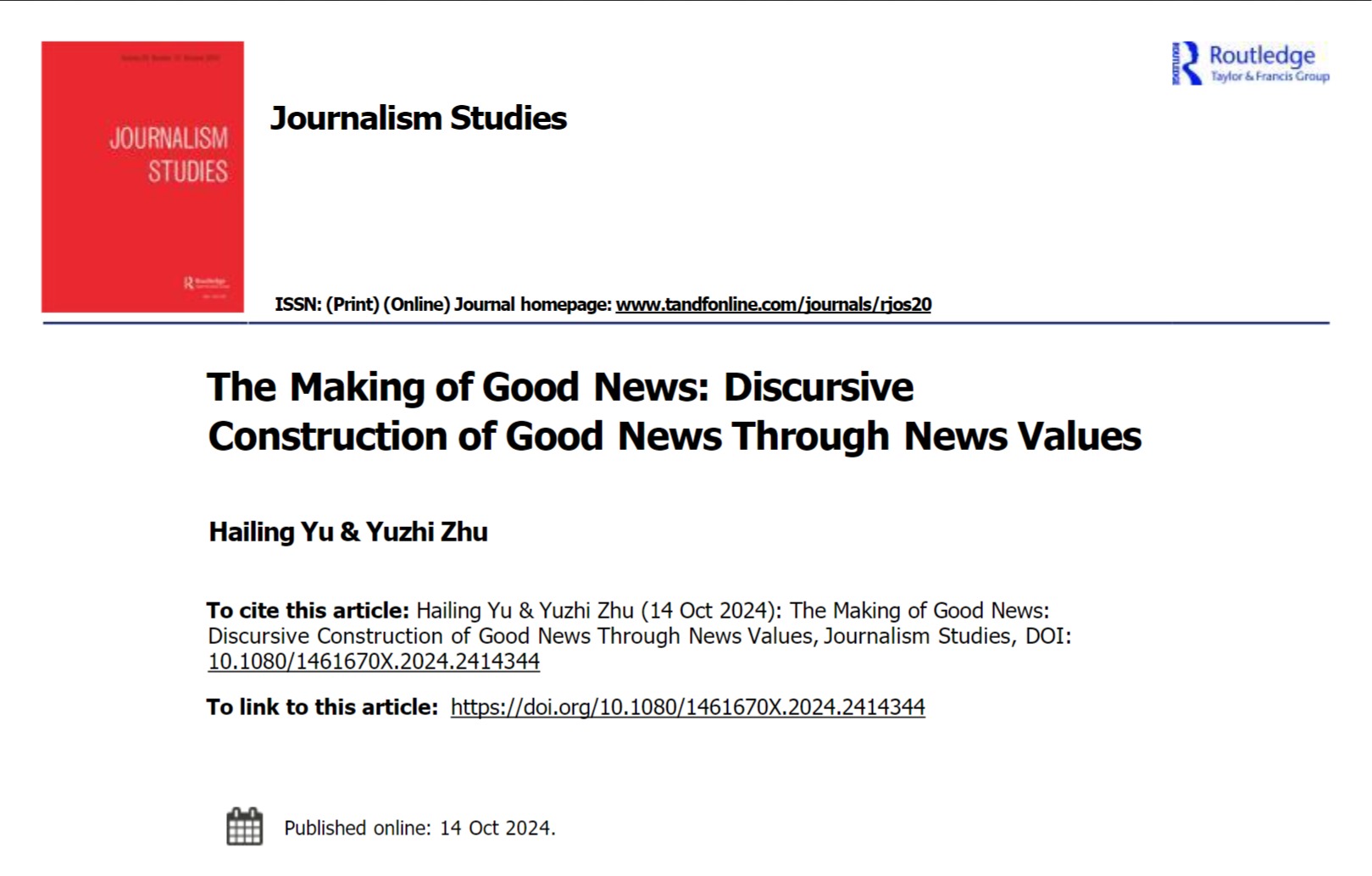 2024/10/24外国语学院于海玲教授跨学科研究成果在新闻传播学顶级期刊发表近日,外国语学院于海玲教授团队在语言学、新闻传播学跨学科研究中取得了新进展。研究成果以“The Making of Good News: Discursive Construction of Good News Through News Values”为题,在新闻传播学领域顶级... -