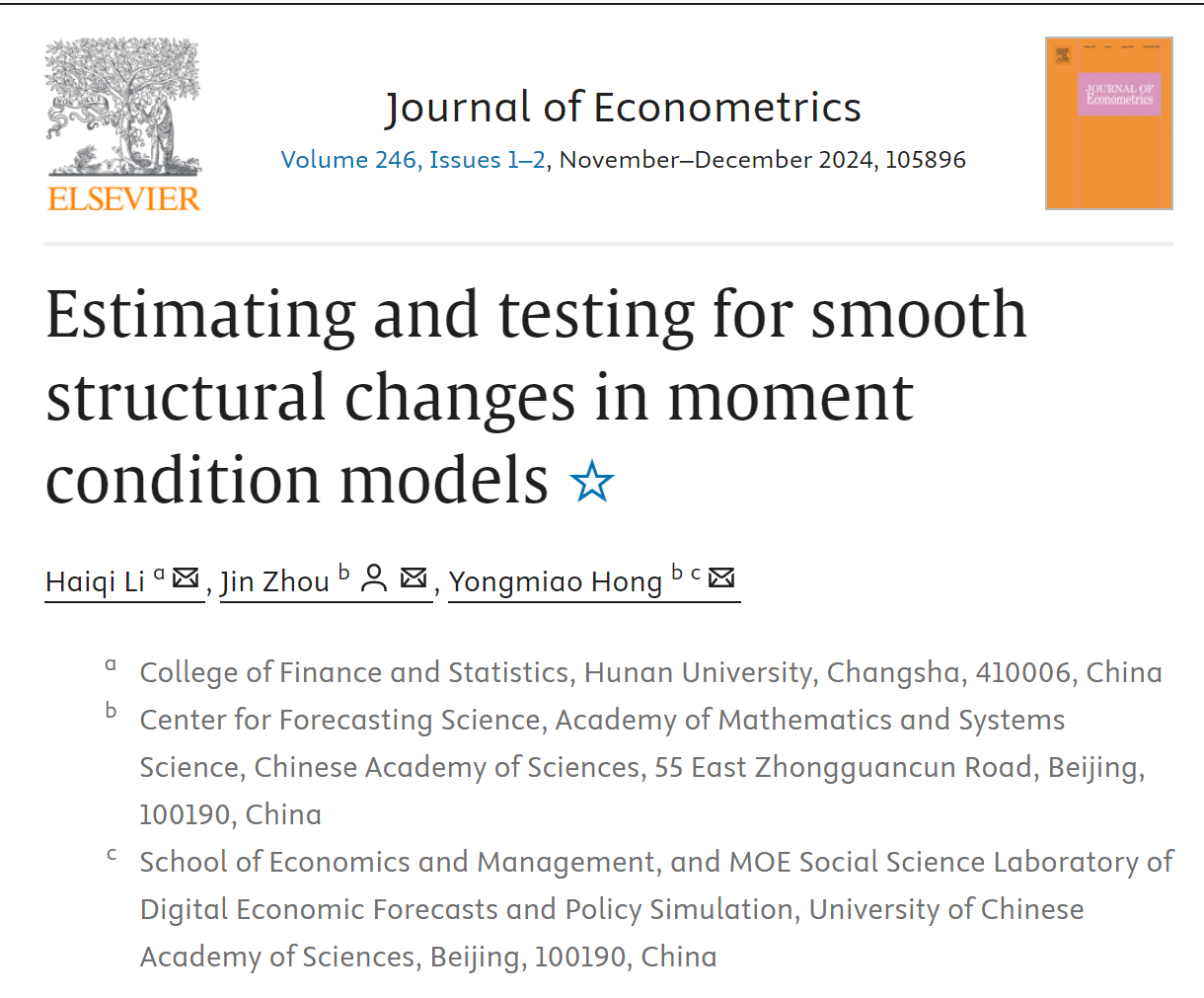 2024/11/25金统院李海奇教授团队研究成果在计量经济学顶刊发表近日,金融与统计学院李海奇教授团队在计量经济学研究领域取得新进展,研究成果以“Estimating and testing for smooth structural changes in moment condition models”为题,发表于计量经济学国际顶尖期刊Jour... -