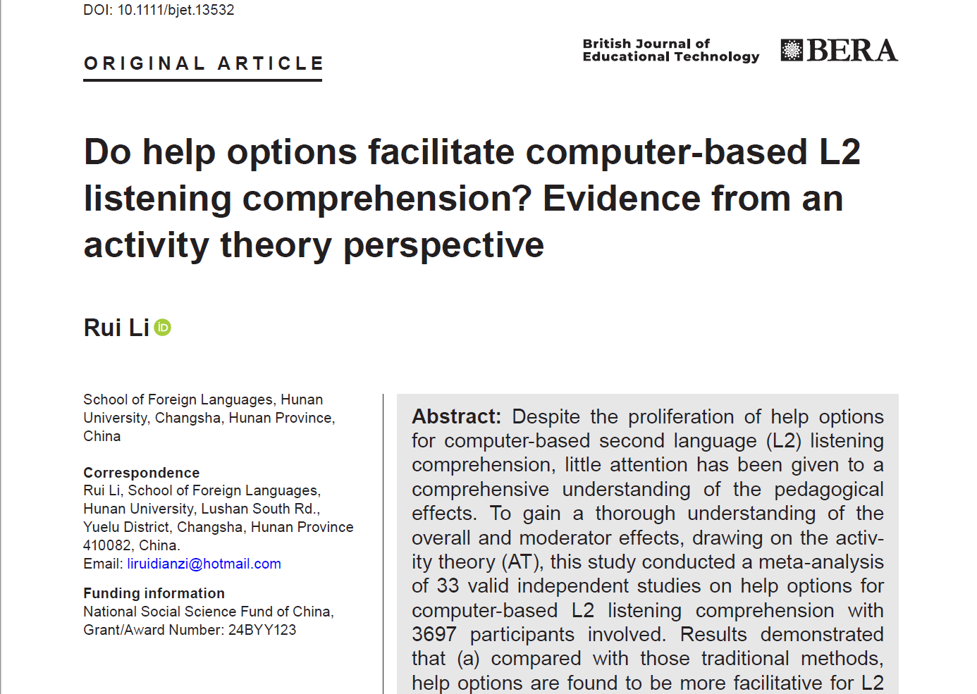 2024/11/13外国语学院李锐教授研究成果在教育学顶级期刊发表近日,外国语学院李锐教授在外语教育学研究领域中取得新进展。该研究以“Do help options facilitate computer-based L2 listening comprehension? Evidence from an activity theory perspective”为题,发表于... -